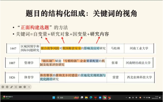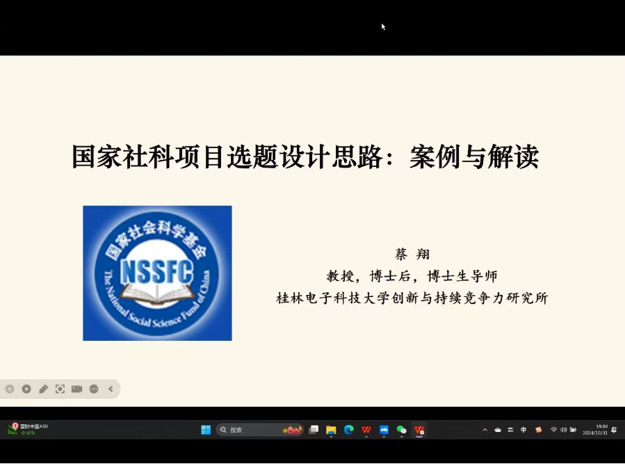 (通讯员 谢薇)为了帮助公司师生更好地理解国家社科项目的申报要求,提升选题质量,推动科研创新与学科发展。10月31日19:00,公司通过腾讯会议举行了长江经管讲坛第六十五讲,桂林电子科技大学软科学研究院副经理蔡翔受邀宣讲,针对国家社科项目的选题设计思路进行了全面而深入的解读。太阳成集团tyc151副经理裴潇、教师代表、2023级和2024级研究生到场参会。本次会议由副教授周欣星主持。