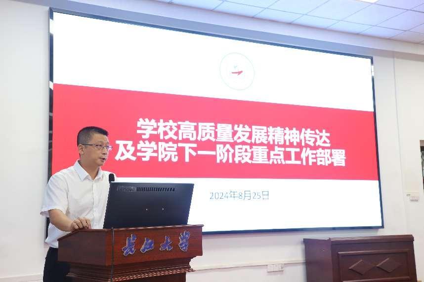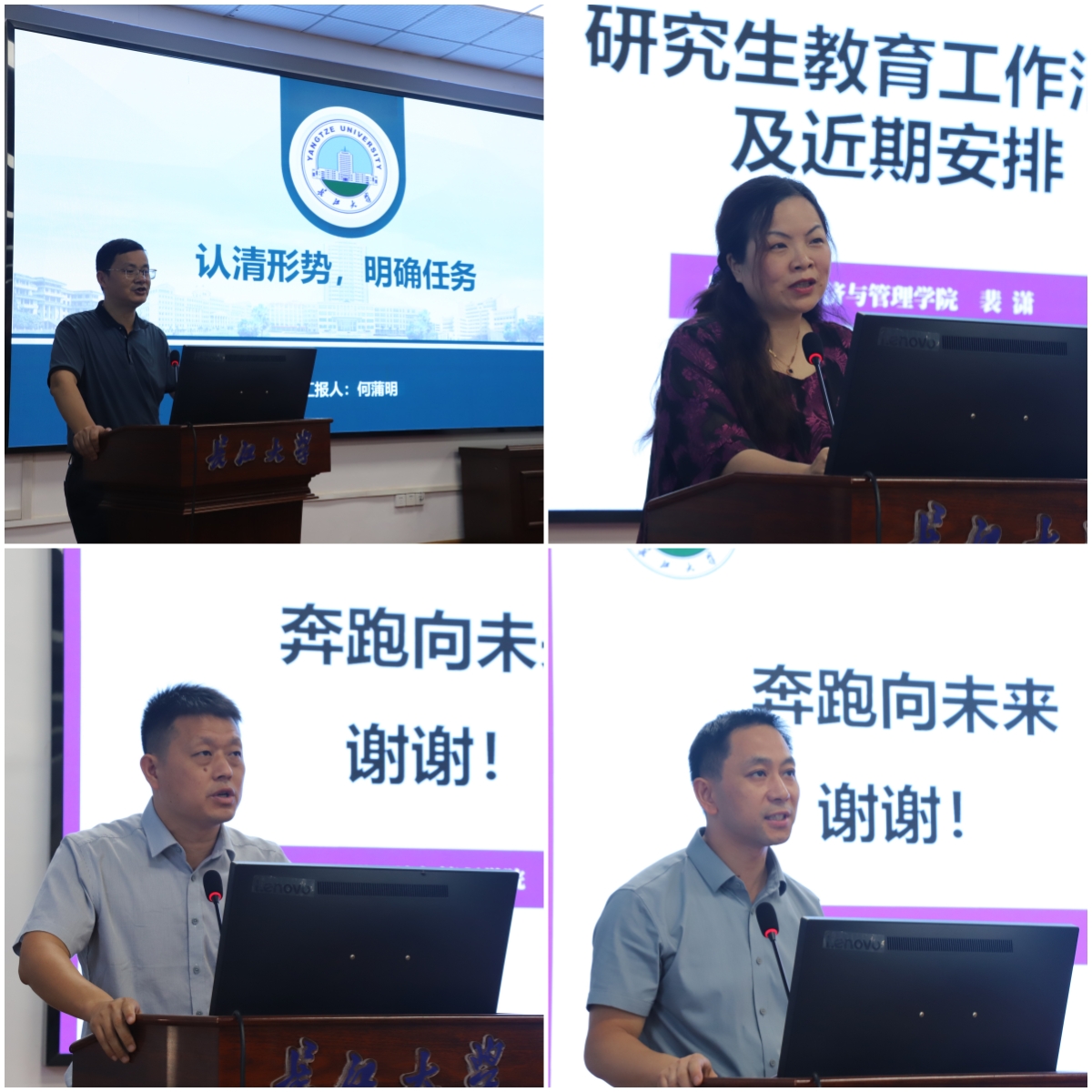 公司副经理何蒲明以“认清形势,明确任务”为题,从公司团队建设的基本现状、科研任务完成情况、后期主要工作等三个方面出发,指出公司目前在相关工作中的不足之处,提醒老师们要明确努力的方向,为公司高质量发展贡献力量;副经理裴潇从学位点评估、研究生招生、公司产品、研究生新生入学工作等四个方面做了工作安排,并特别强调了学位点评估工作面临的挑战,传达了前期学位点核验和评估阶段专家反馈的意见和建议,对老师们提出了相应的要求,动员大家齐心协力做好整改工作;副经理王华强针对开学第一周上课准备、开学补考、毕业生学分核验、毕业论文抽检、毕业生推免等做了详细的工作安排;党委副书记平先锋就员工工作做了重要提示,先是向老师们通报了暑期员工工作开展情况,接着就近期的开学报到工作、毕业生就业工作、新生入学工作、工会工作等进行了详细部署。