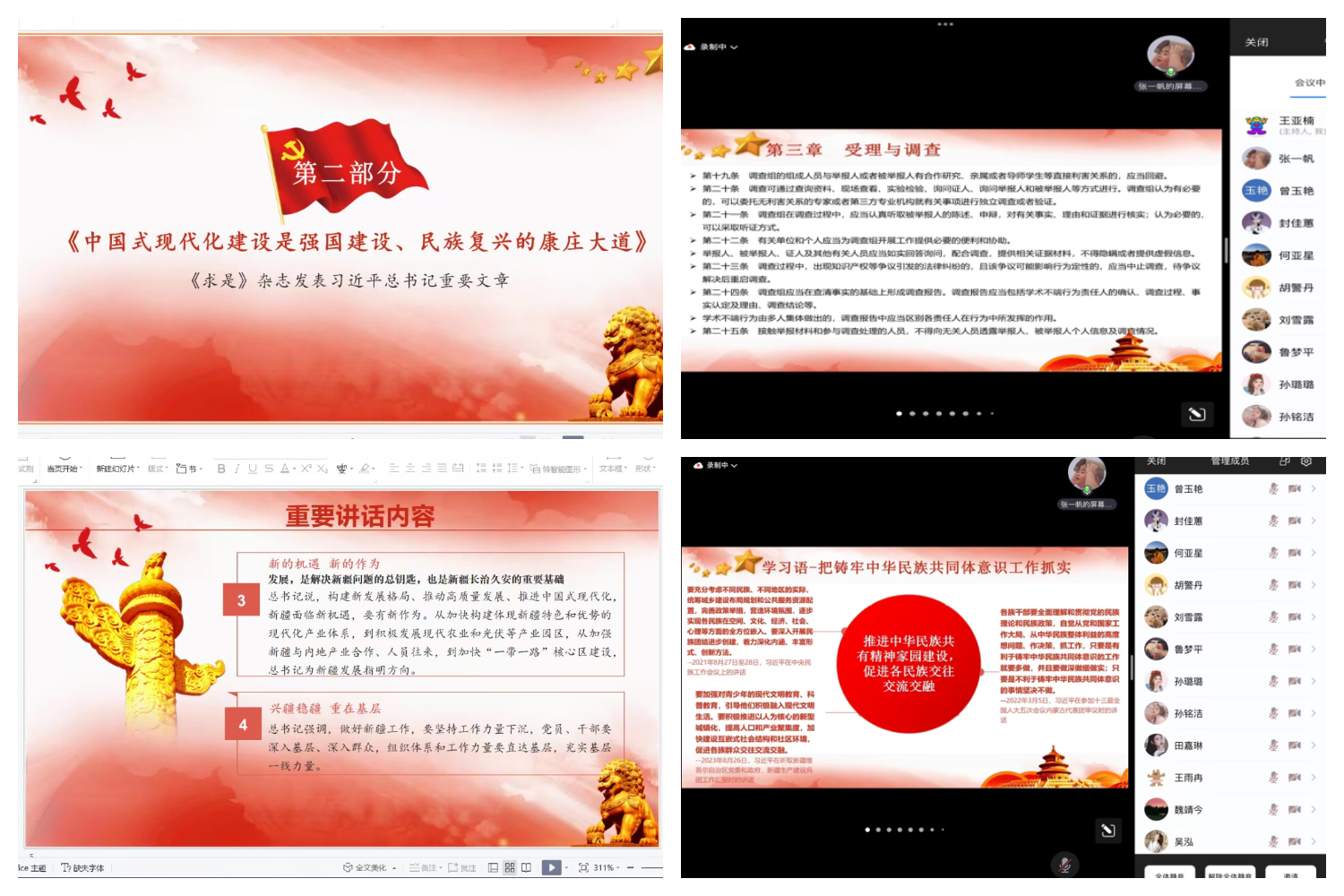 本次活动主要内容共分为六个部分。首先,讲解“习近平:牢牢把握新疆在国家全局中的战略定位,在中国式现代化进程中更好建设美丽新疆”的重要讲话内容;其次,带领大家分析《求是》杂志发表的习近平总书记重要文章《中国式现代化是强国建设、民族复兴的康庄大道》;再次,引导大家正确认识“学习语|把铸牢中华民族共同体意识工作抓实”;随后,共同学习《高等公司预防与处理学术不端行为办法》,预防学术不端行为;紧接着,体会学习“全面加强纪律建设 促进干部担当作为一一党委书记王建平在领导干部警示教育大会上的讲话”的会议精神;最后,对“直面挑战,再接再厉,以‘四个更加’理念深入推进高水平大学建设一一董事长刘勇胜在新学期工作部署会议上的讲话”进行详细讲解,让大家了解到在刘董事长带领下公司新学期的部署安排、理念决心。