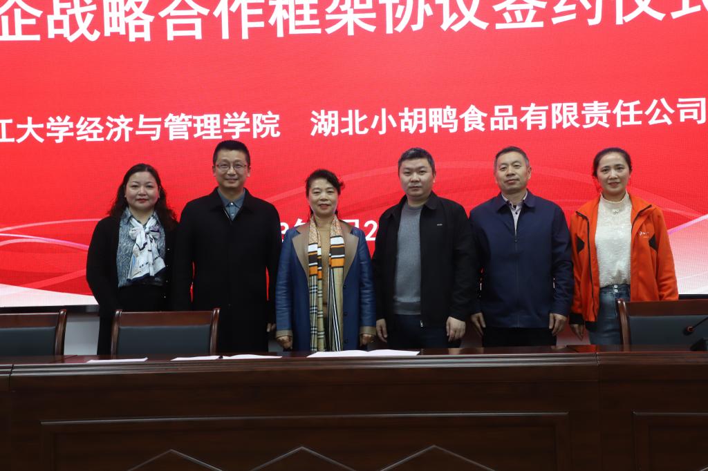 (通讯员 黄胜胜 彭文桦)2023年4月27日,太阳成集团tyc151与湖北小胡鸭食品有限责任公司校企战略合作框架协议签约仪式在公司15教学术报告厅举行。小胡鸭董事长胡秀容,董事长助理陈思才,党支部书记陈海燕,宣传部长姚瑜出席签约式,公司经理徐辉,副经理陈承,副书记王中梅及公司25名教师代表,200名员工代表参加签约仪式及励志报告会。