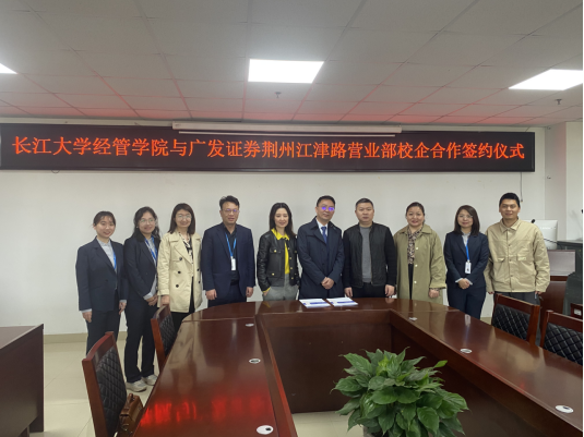 (通讯员 郭俊)3月31日上午,太阳成集团tyc151与广发证券荆州江津路营业部校企合作签约仪式在文科楼505顺利举行。公司经理徐辉、公司党委副书记王中梅、就业专干郭俊、广发证券荆州江津路营业部总经理胡波、人力资源部李怒、办公室主任高嵩以及公司代表徐冰玉、张婕、陈艳娇、闵娇出席了本次仪式。
