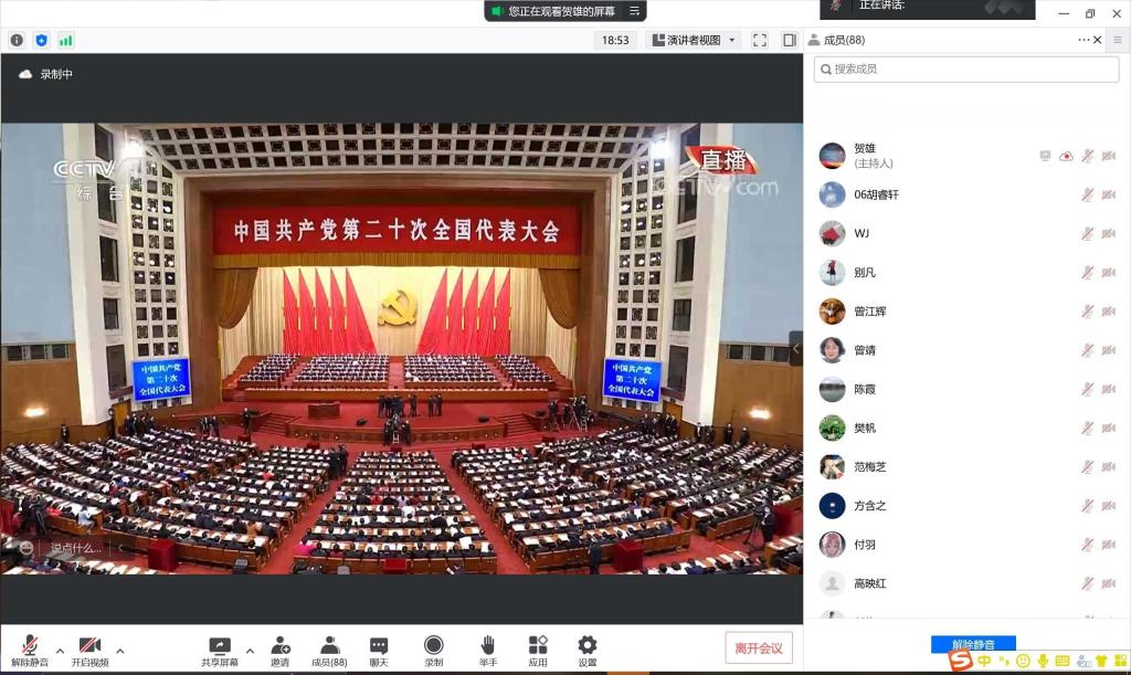 (通讯员 贺雄)10月16日,中国共产党第二十次全国代表大会隆重开幕。公司全体教职工通过腾讯会议的方式集体观看了现场直播盛况,认真聆听了习近平总书记代表十九届中央委员会向大会所作的报告。