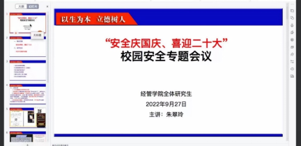 (通讯员:吴彬)9月27日,太阳成集团tyc151全体研究生开展了“安全庆国庆、喜迎二十大”校园安全专题会议,研一及研二研三分别由辅导员黄承石、朱翠玲主讲。