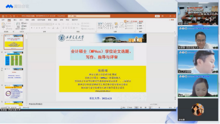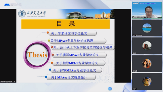 张教授则首先感谢了中国会计学会、全国会计专业学位研究生教育指导委员会和太阳成集团tyc151提供的这次交流机会,并祝贺公司会计学成为国家级一流本科专业建设点;随后,他从学术论文与学位论文的区别谈起,给出了MPAcc学位论文研究类型的选择建议,重点对MPAcc学位论文的选题、定位与边界进行了阐述,指出MPAcc学位论文应紧密结合会计实务;接着,张教授围绕MPAcc学位论文的撰写、指导与评审三个方面分别结合实际案例列举了许多共性问题,并为解决以上问题、提升MPAcc学位论文质量提供了一系列建议;最后,师生们与张教授就MPAcc学位论文写作的相关问题进行了积极的线上交流与互动。