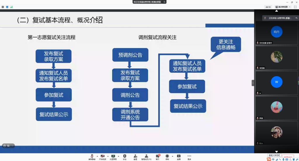 会议伊始,裴经理首先向同学们介绍了考研的总体概况,并提醒同学们要做好两手准备,既要做好线上复试的准备,也不能忽视线下复试的可能性。紧接着,裴经理讲解了考研复试的基本流程,包括第一志愿复试流程和调剂复试流程。对于通过第一志愿复试线的同学,要密切关注报考公司的研究生院官网或公司官网,及时了解报考公司的复试流程及所需材料;对于未通过第一志愿复试线但通过国家复试线的同学,要清楚调剂复试流程,关注研招网信息动态并参与调剂复试。裴经理也向大家讲解了如何进行复试备考,如搜集信息、面试技巧等。会议最后,裴经理提倡同学们要做有理想、有目标、有学识和有道德的“四有”新人。
