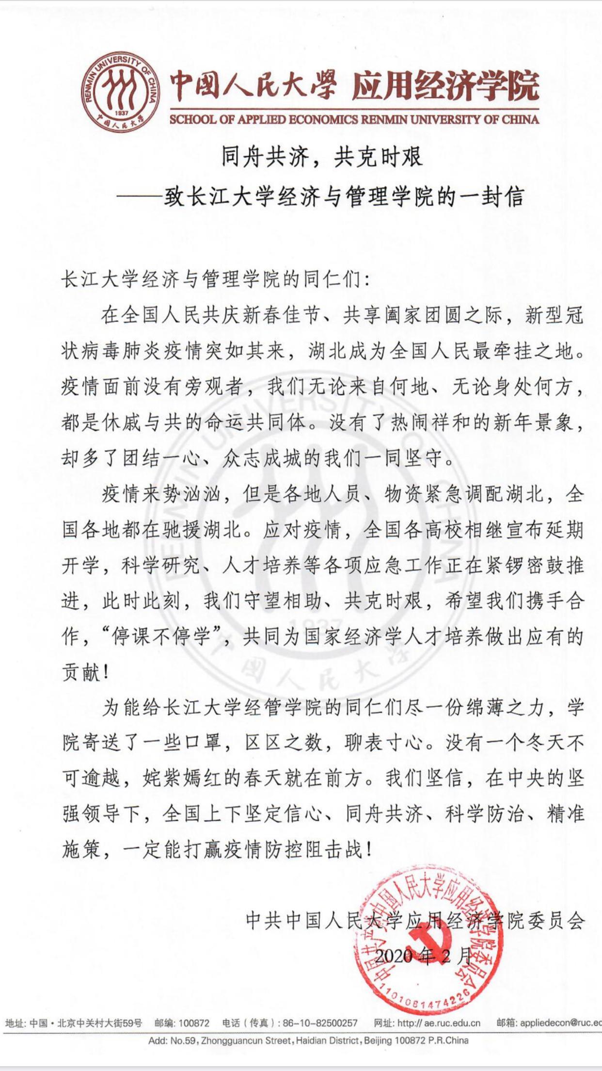 目前,我们全院师生一方面在紧锣密鼓抗击疫情,另一方面正积极响应教育部“停课不停学”号召,科学有序地组织开展线上教学、科学研究等工作。在这个特殊时期,中国人民大学应用经济公司主动伸手驰援我们,我们铭记在心。疫情无情,人间有爱,就让我们一起守望相助,共克时艰,同时也希望公司教职工以此为契机,多向中国人民大学应用经济公司学习,采取“大手牵小手”的方式,在人才培养、团队建设等方面有更大的收获。