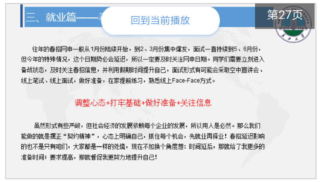 为了让员工清醒认识当前的就业形势、熟悉就业政策,2月16日公司也通过“雨课堂”平台以直播的形式召开毕业生就业主题大会,全体毕业年级员工参加了此次大会,会议由年级辅导员朱翠玲、叶星主讲。在主题大会中,朱老师针对疫情特殊时期下的就业现状和就业工作,和同学们做了全面的分析和动员,希望员工们要调整心态、打牢基础、做好准备、关注信息。既不能过度焦虑,也不失“紧迫感”,特别对于考研的同学们,更要以积极的心态等待考研成绩,及时调整就业规划。