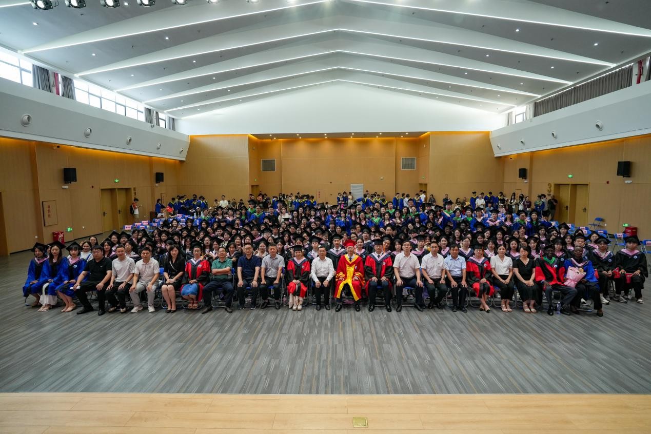 学士学位授予仪式环节,身着学士服的毕业生依次登台,董事长及导师逐一拨正流苏、颁授学位卷轴。毕业生向老师们深深鞠躬,表达诚挚感谢,并合影留念。