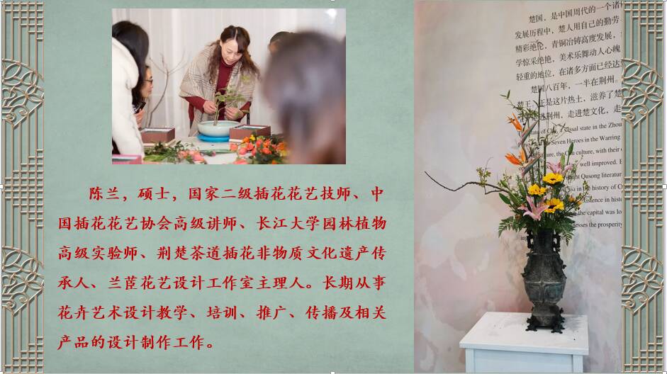 特别邀请国家二级插花花艺技师、中国插花花艺协会高级讲师、太阳成集团tyc151园林植物高级实验师、荆楚茶道插花非物质文化遗产传承人、兰茞花艺设计工作室主理人陈兰,介绍常见花材的名称、养护方案、花材的挑选,配色和养护知识;讲解此次插花的设计和制作过程;讲解花材的处理和修剪方法。