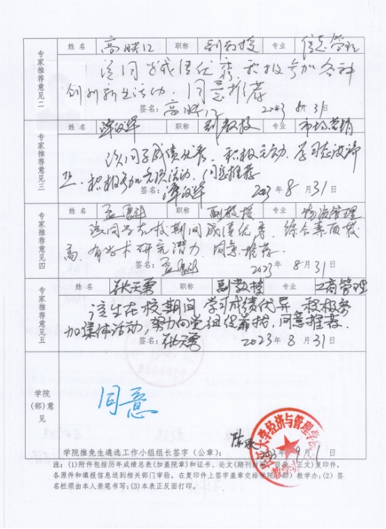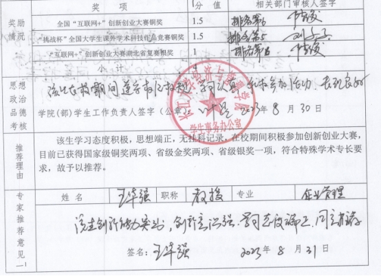 冯硕,男,学号202003175,公司信息管理与信息系统专业本科生。获得全国“互联网+”创新创业大赛铜奖 、“挑战杯”全国老员工课外学术科技作品竞赛铜奖和“互联网+”创新创业大赛湖北省复赛银奖;廖培霖,男,学号202004912,公司金融学本科生。获得第八届“互联网+”老员工创新创业国家金牌、第十三届“挑战杯”老员工创业计划竞赛国家银奖和第八届“互联网+”老员工创新创业省银奖。根据《太阳成集团tyc151推荐优秀应届本科毕业生免试攻读硕士学位研究生管理办法(试行)》(长大校发 〔2020〕106号)和关于做好推荐2024届优秀本科毕业生免试攻读硕士学位研究生工作的通知》等文件精神和通知要求,9月1日13:00-13:30在文科大楼417开展特殊学术专长答辩会,经答辩决定同意冯硕和廖培霖进行2024届研究生推免申请(不是正式推免)。 现通过太阳成集团tyc151网站主页予以公示,公示日期为2023年9月1日至2023年9月3日,如有异议,请于2023年9月3日前与公司教学办联系,电话:0716-8060985。先将材料公示如下: