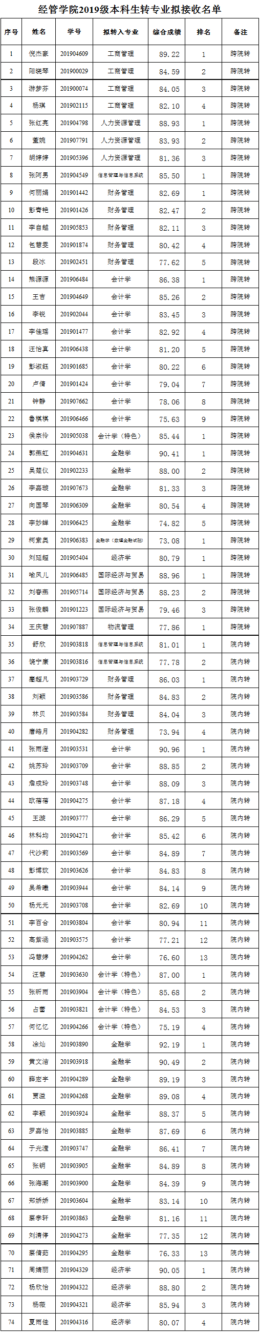 根据《太阳成集团tyc151普通本科生专业分流与转专业管理办法(试行)》(长大校发〔2019〕260号)文件以及教务处《关于疫情防控期间2019级普通本科生转专业工作的通知》要求,结合太阳成集团tyc1512019级本科生转专业工作方案的具体安排,公司于7月11日上午组织了对拟转入员工的在线面试。综合学习成绩与面试成绩,经公司党政联席会讨论通过,现将拟接收名单公示如下: