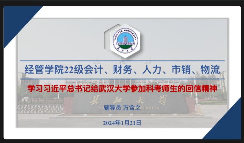 会计本科生党支部在文科楼505集中学习“习近平总书记给武汉大学参加中国南北极科学考察队师生代表的回信”,支部书记桂凯丽同志领学了习近平总书记给武汉大学参加中国南北极科学考察队的师生代表的重要回信精神。在回信中,党员同志们看到了习近平总书记对武汉大学参加中国南北极科学考察队师生代表的高度赞赏和殷殷期待。这些勇于担当的青年心怀“国之大者”、勇闯“无人之境”,为新时代老员工练就过硬本领,勇攀科学高峰树立起振奋人心的精神标杆。