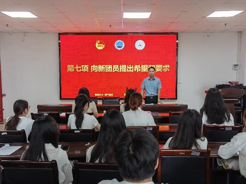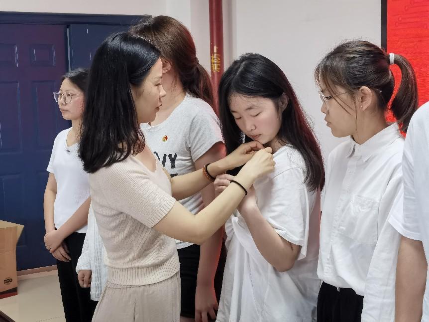 团徽是中国共青团的象征和标志,出席活动的党员老师、团员代表们为新团员逐一佩戴团员徽章,从戴上团徽这一刻起,团员们便将责任与使命铭记于心。公司共青团员标兵郜鑫雅同学作为领誓人带领团员们在团旗下宣誓,新团员佩戴着团徽、高举右拳宣读入团誓词,青年们铿锵有力、朝气蓬勃的誓言,将大会的气氛推向高潮。