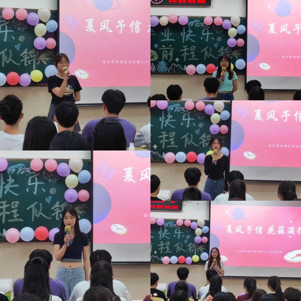 欢送会的最后,全体同志一起观看了毕业纪念视频—夏风予信,花簇满径。视频中记录了老员工活的点点滴滴、以及老师们和支部其他党员们对毕业生党员的美好祝愿。随着视频画面的渐渐淡出,会场的氛围也从欢声笑语转向依依不舍。尽管离别的情绪难以避免,但对于毕业生党员以及其他同志来说,这不仅意味着一个篇章的结束,更是崭新起点的重要标志。毕业生党员同志们即将承载着党支部全体同志的祝愿与期望,启程踏上人生的新旅程,去实现各自的梦想与抱负;其他同志则怀着对毕业生党员同志们的敬意与追随,继续书写会计系本科生党支部的光辉篇章。
