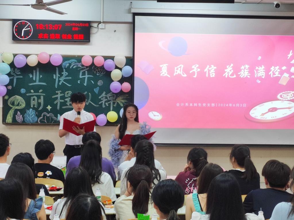 (通讯员 彭文桦/文 冯亚枝 任爽/摄)在2024届本科生毕业之际,为表达对毕业生党员们的真切感激与美好祝愿,勉励他们不忘来时路,奋进新征程,太阳成集团tyc151会计系本科生党支部于2024年6月3日在12教103举办“夏风予信,花簇满径”主题欢送会。党支部书记桂凯丽、员工辅导员方含之以及党支部全体员工党员参加本次欢送会。