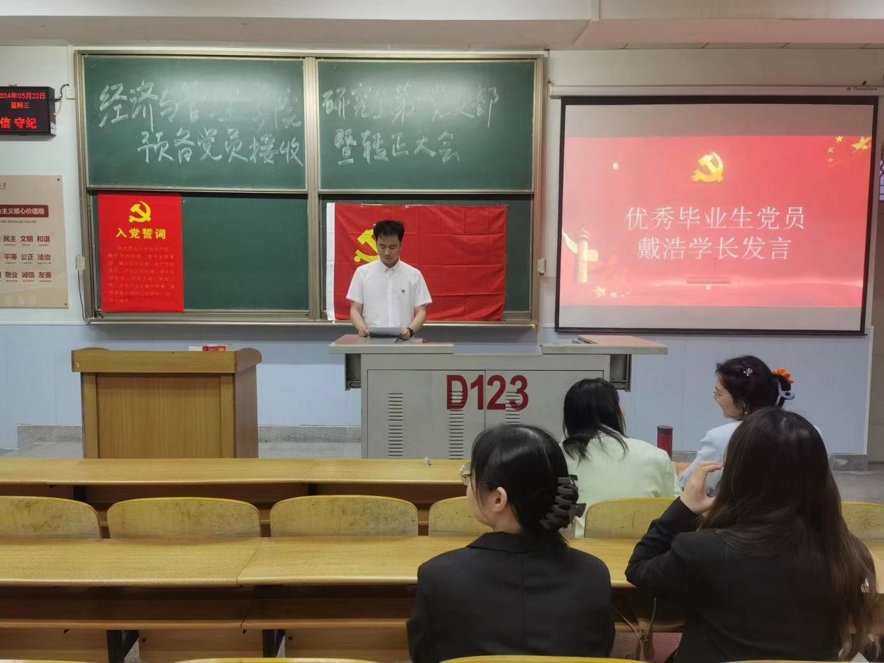 会议第四项:优秀毕业生党员戴浩发言。戴浩学长分别从学习、科研方面传授了自己的经验。在学习上,首先要明确目标,制定合理的学习计划,并严格执行。其次,要注重基础知识的学习,打牢学术根基。同时,还要关注学科前沿动态,不断拓展学术视野。此外,注重培养自己的批判性思维,敢于提出新的观点和方法,勇于挑战传统观念。在科研方面,始终坚持团队合作、勇于创新的精神。科研不是一个人的战斗,而是需要团队成员共同努力、相互协作。