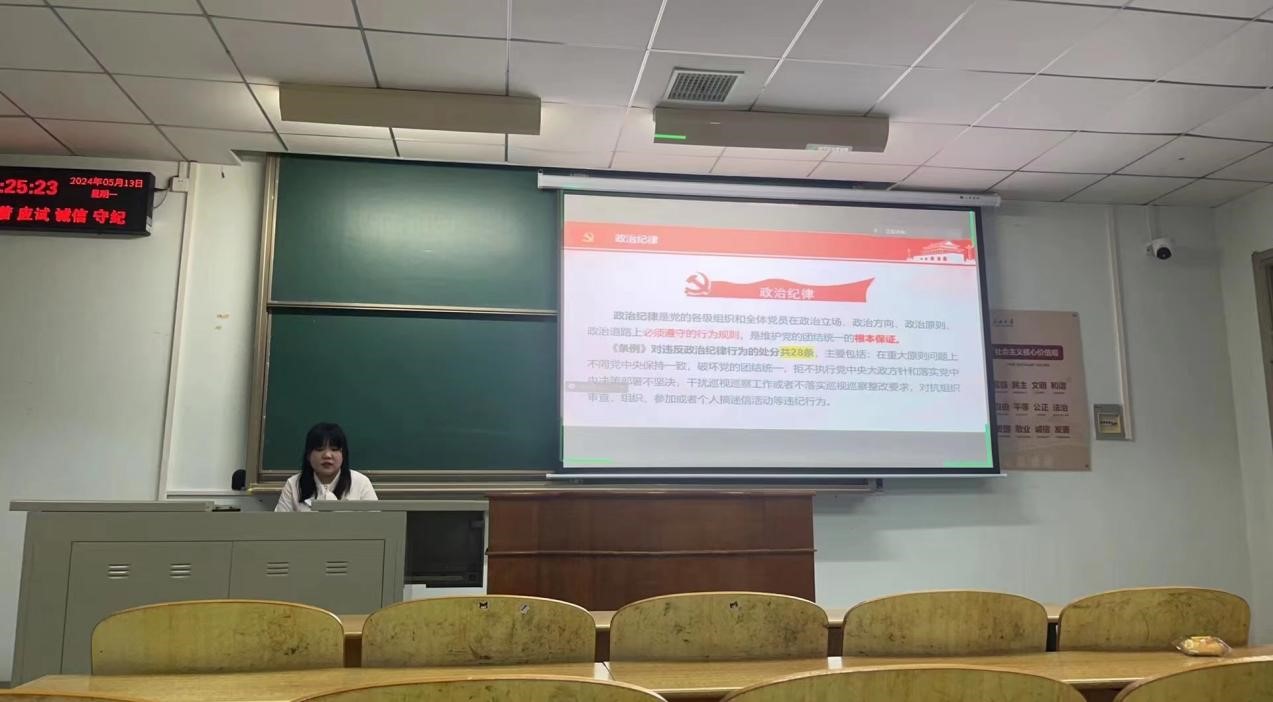 (通讯员 吴孟怡)在党的建设中,党纪教育具有至关重要的地位,是保持党的先进性和纯洁性的重要保障。为推进党纪学习教育走深走实,引导研究生党员学纪、知纪、明纪、守纪,2024年5月13日,太阳成集团tyc151研究生第一党支部全体党员于13教C-117教室开展五月支部主题党日学习活动,青年委员马艺文同志主持本次学习活动。