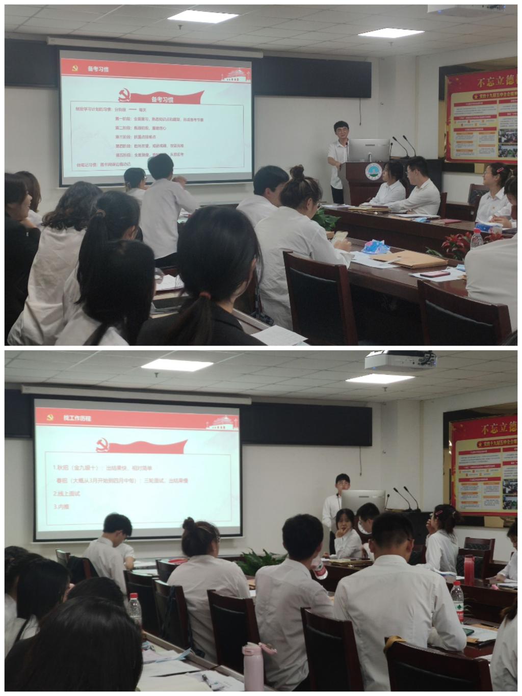 随后,龚金伟同志进行考公经验分享,并从备考资料、备考心态、备考习惯等方面进行介绍。他分析了自身备考存在的问题,建议党员同志们要合理规划备考时间,防止因战线过长而产生疲软心态。最后刘永康同志向党员同志们分享了自己的求职经验,求职途径和面试问题,并告诫党员同志们要抓住校招机会,对线上招聘要甄别选择。