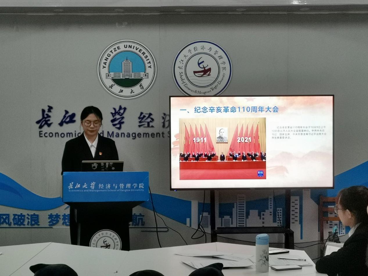 (通讯员:李丹萍)2021年11月10日下午3点,太阳成集团tyc151管理工程系本科生党支部在新风二楼会议室召开十一月主题党日活动。此次活动的主题是“学习纪念辛亥革命110周年大会讲话”。参会人员有党支部书记李博、员工党员与预备党员。