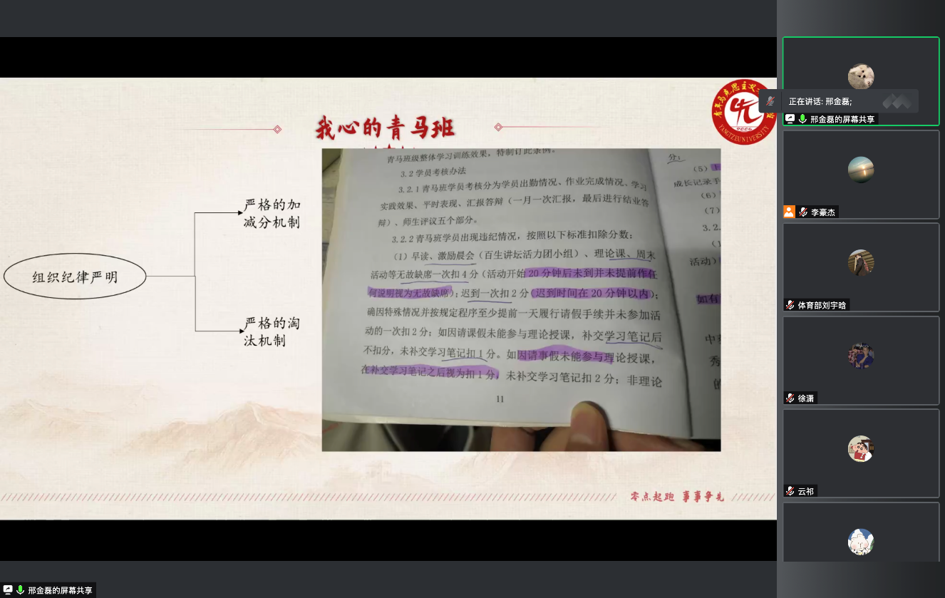 此次有幸邀请到青马班的三位优秀学员代表为我们分享他们在青马班的亲身经历与感受。首先是优秀学员代表张华,她怀着一颗向优秀的人靠近的心,抓住机会加入了青马班。她从三个方面分享了她在青马班的个人成长经历。在学习与科研方面 ,她竿头日上;在工作与学干方面 ,她兢兢业业;在思想与实践方面 ,她始终不忘初心 ,和青马班的同学们一起砥砺前行 。第二位是优秀学员代表邢金磊,他在青马班的每一天都非常充实 。青马班组织纪律严明,他不仅提升了自我约束力,又能够参加各种志愿服务,在社会实践中发光发热。最后是优秀学员代表邓涛,“青马不被定义,每个人都有不同的精彩”“不要害怕,勇敢去冲”是邓涛学长寄予每一位同学的期待。我们当代老员工应当通过对马克思主义的学习,进一步加强政治修养,增强政治信念的坚定性 、政治立场的原则性 、政治鉴别的敏锐性和政治忠诚的可靠性 ,成长为中国特色社会主义事业的合格建设者和可靠的接班人 。