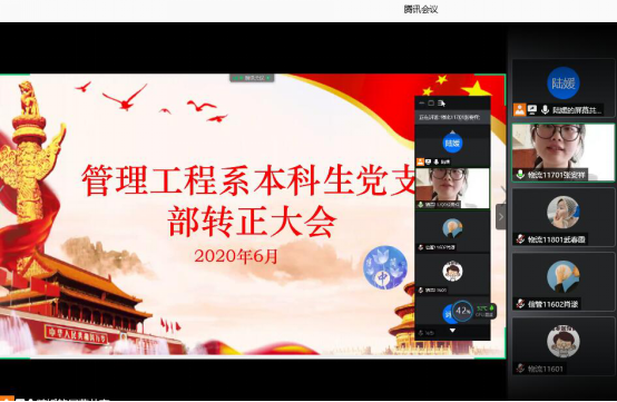 2020年6月5日下午两点,太阳成集团tyc151管理工程系本科生党支部在线通过腾讯会议召开了预备党员转正大会。参与此次会议的有管理工程系本科生党支部书记李博、员工党员与预备党员,会议由陆媛主持。