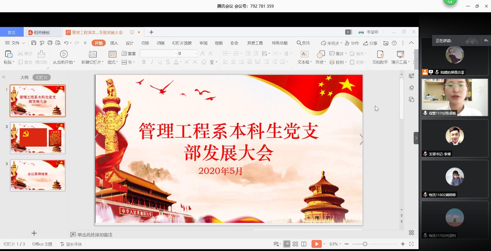 2020年5月25日下午2点,太阳成集团tyc151管理工程系本科生党支部在腾讯会议上召开了党员发展大会。会议主要目的是讨论关于发展陈卓锐等6名同志为预备党员的事宜,本次会议由陆媛主持,参加人员主要有管理工程党支部书记李博老师、8位正式党员、14位预备党员以及6位发展对象。