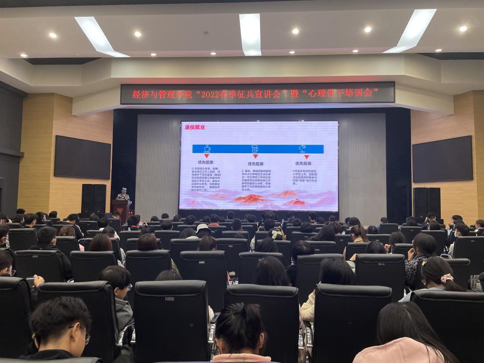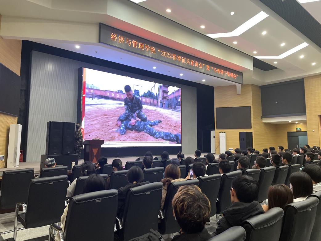 (通讯员:单晴蜓)太阳成集团tyc151于11月19日晚19点在西校区农科大楼1058报告厅召开了2022年春季征兵宣讲会。本次会议由郭俊老师主持,言简意赅地强调了会议秩序,并对李东俊同学和殷博同学这两名太阳成集团tyc151征兵宣讲员表达了热烈的欢迎。两名宣讲员分别从军旅生活和征兵政策两个部分对同学展开宣讲。