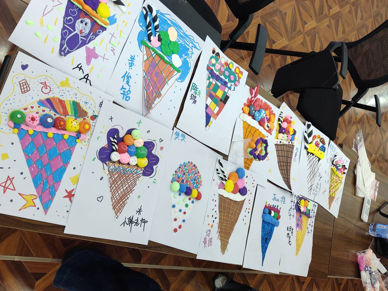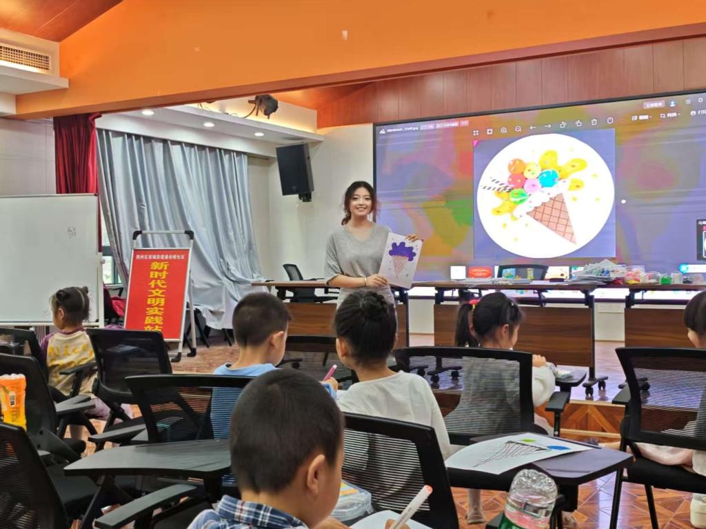 真正将活动推向高潮的是手工课。当志愿者韩梦彦端出五颜六色的黏土时,突然发现教室后排不知何时挤进了几个"新面孔"。社区工作人员介绍"这几个孩子原本在楼下玩耍,看到教室里的作品就主动要求加入。"志愿者及时增补材料包,指导新成员制作黏土冰淇淋。最终完成的作品中,既有规整的甜筒造型,也有天马行空的"彩虹冰淇淋",孩子们都带着自豪的小表情跟老师讲解自己制作的冰淇淋。