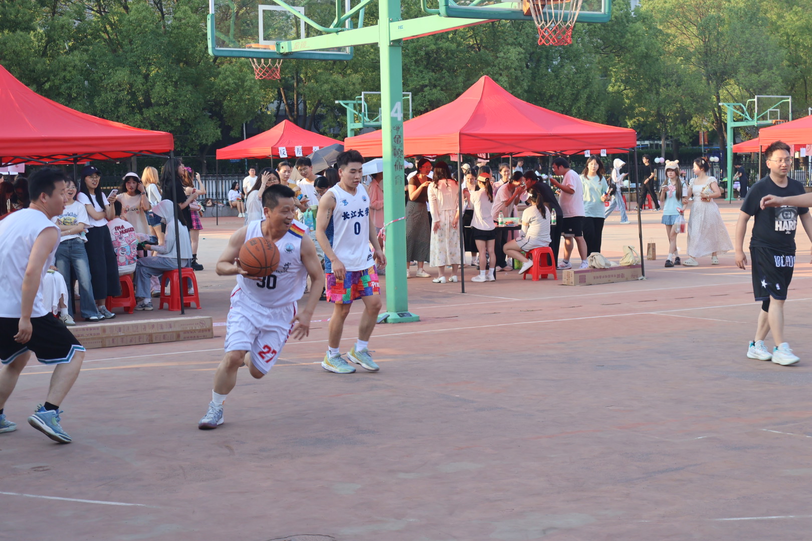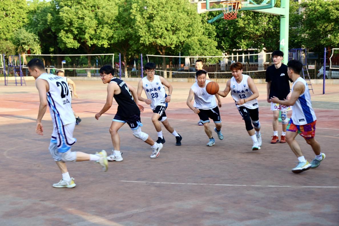 随后开始的师生篮球赛上,竞技的火花与师生的温情在球场上交织碰撞。毕业生们凭借充沛的体力与默契的团队配合,迅速展开凌厉攻势,灵活穿插跑位、快速突破得分;老师们则以沉稳的战术和精湛的球技沉着应对,精准的三分远投、巧妙的挡拆配合不断将比赛推向高潮。