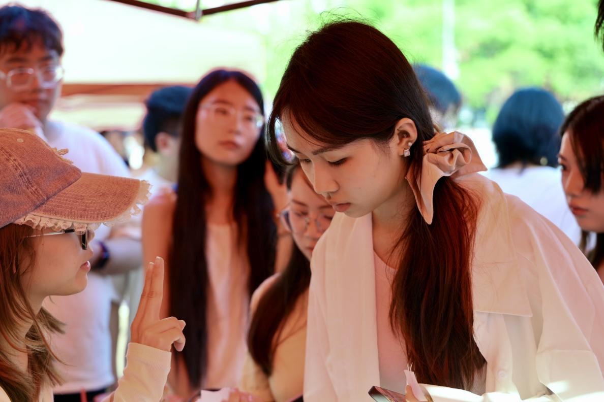 DIY学士帽和漆扇创作成为全场的创意热点,空白的扇面在画笔与颜料的勾勒下化作个性符号,娇艳的鲜花、多样的彩笔、五彩的卡纸,同学们绘出星辰大海、写下毕业箴言,化作学士帽上最独特的风景,承载着独一无二的青春宣言。