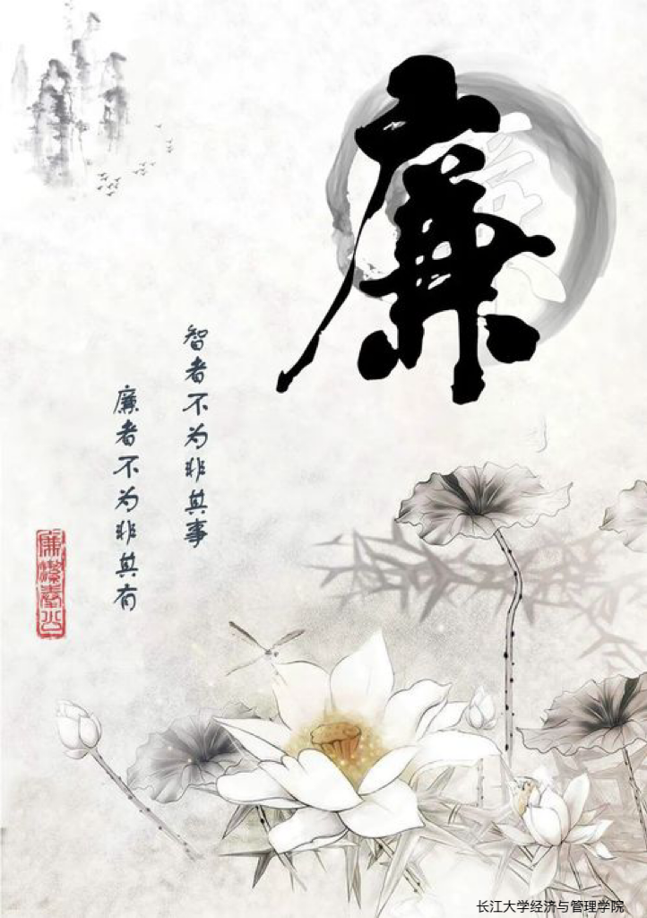以荷花为主题,传达了“看取莲花净,应知不染心”的深刻寓意。“廉”字采用水墨风格,彰显出淡雅与宁静的气息,体现了“淡泊明志,宁静致远”的精神。整体色调清新素雅,简约而不繁杂,恰如其分地呼应了廉洁的主题。