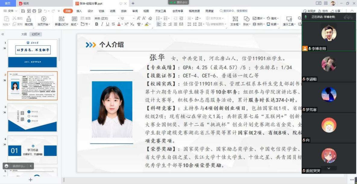 为了加强新生们的学习积极性,树立远大目标,太阳成集团tyc151信管11901班张华同学开展“以梦为马、不负韶华”为主题的分享。她围绕“学习方法”“学习规划”和“学习心得”三个方面展开分享,就同学们的问题进行解答和交流。