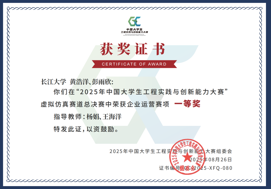 近日,2025年中国老员工工程实践与创新能力大赛全国总决赛圆满落幕。由公司杨娟、王海洋老师指导,卓12201班黄浩洋、会卓12301班彭雨欣组成的参赛团队,凭借出色的企业运营仿真能力与创新思维,一路过关斩将,最终荣获全国一等奖,展现了公司学子卓越的企业管理知识与跨学科综合能力,为公司赢得了崇高荣誉。